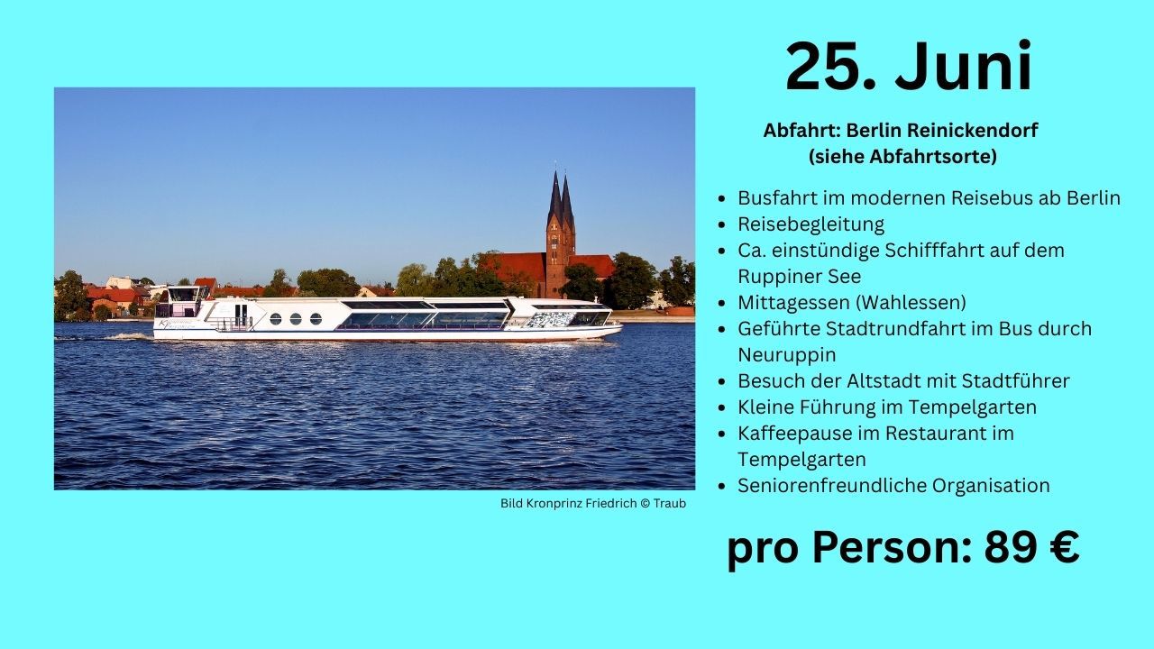 Rund 70 Kilometer nordwestlich von Berlin gelegen, verbindet Neuruppin auf besondere Weise Wasser, Geschichte, Architektur und Kultur. Freuen Sie sich auf eine entspannte Schifffahrt auf dem Ruppiner See, ein gemeinsames Mittagessen, eine geführte Stadtrundfahrt sowie einen stimmungsvollen Abschluss im Tempelgarten Neuruppin. Die Fahrt ist ruhig organisiert, persönlich begleitet und auch für Gäste mit Rollator gut geeignet.