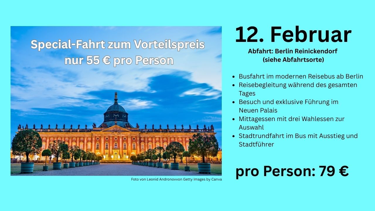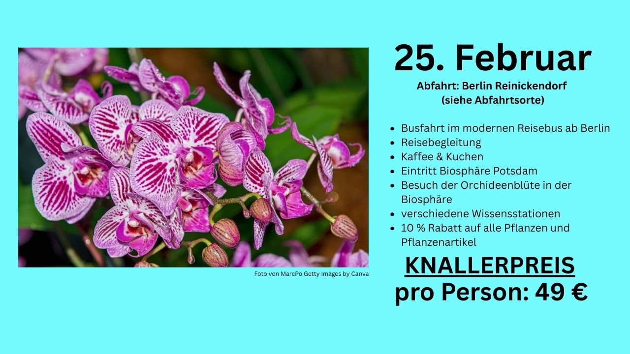 Die Orchideenblüte in der Biosphäre Potsdam ist ein Highlight, das jedes Jahr Tausende begeistert – und Sie erleben sie im Rahmen einer perfekt organisierten Bus Tagesfahrt ab Berlin. Kaffee & Kuchen unter Palmen, ein faszinierender Rundgang durch das Tropenhaus und ein exklusiver Rabatt im Shop machen diesen Ausflug zu einem besonderen Wintererlebnis. Und selbstverständlich nehmen wir auch Ihren Rollator sicher und unkompliziert im Bus mit.