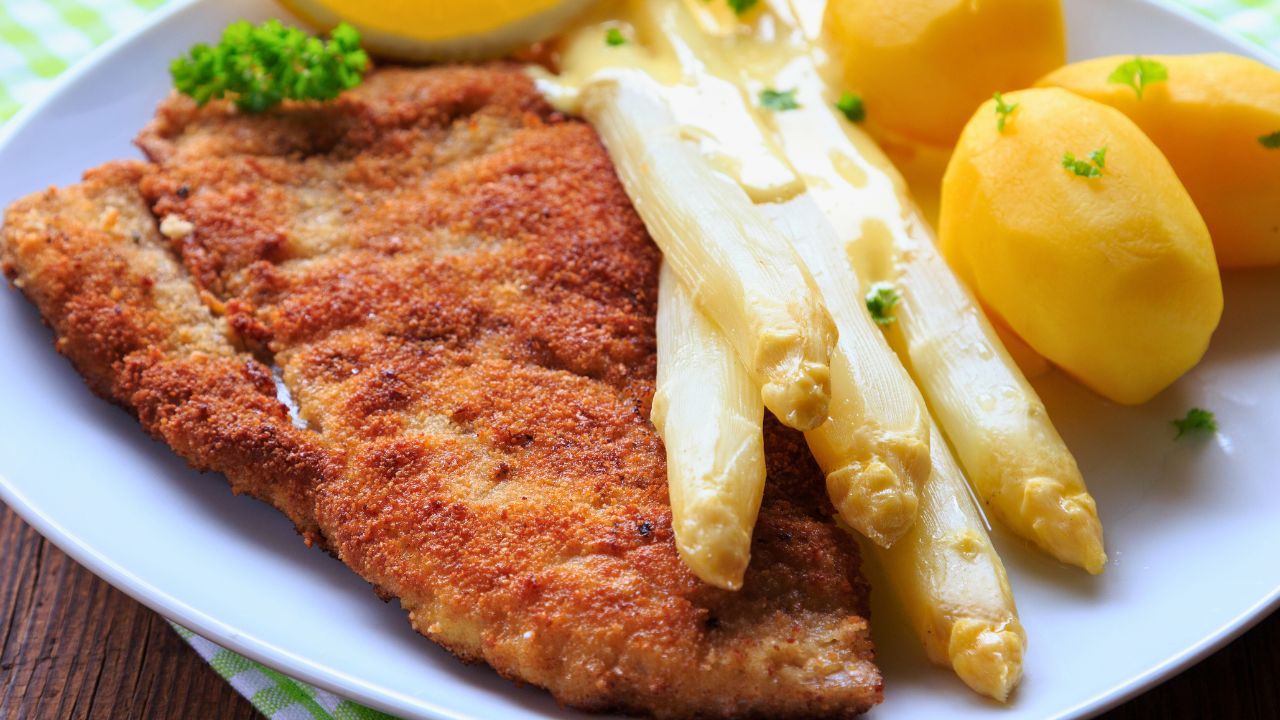 2. Portion weißer Spargel mit knusprigem Schweineschnitzel und Petersilienkartoffeln