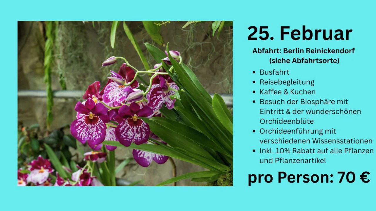 Stellen Sie sich vor, Sie steigen in Berlin-Reinickendorf entspannt in unseren Reisebus, lehnen sich zurück und schon wenig später tauchen Sie in eine tropische Welt aus Farben, Düften und exotischen Pflanzen ein. Die Orchideenblüte in der Biosphäre Potsdam ist ein Highlight, das jedes Jahr Tausende begeistert – und Sie erleben sie im Rahmen einer perfekt organisierten Bus Tagesfahrt ab Berlin. Kaffee & Kuchen unter Palmen, ein faszinierender Rundgang durch das Tropenhaus und ein exklusiver Rabatt im Shop machen diesen Ausflug zu einem besonderen Wintererlebnis. Und selbstverständlich nehmen wir auch Ihren Rollator sicher und unkompliziert im Bus mit.
